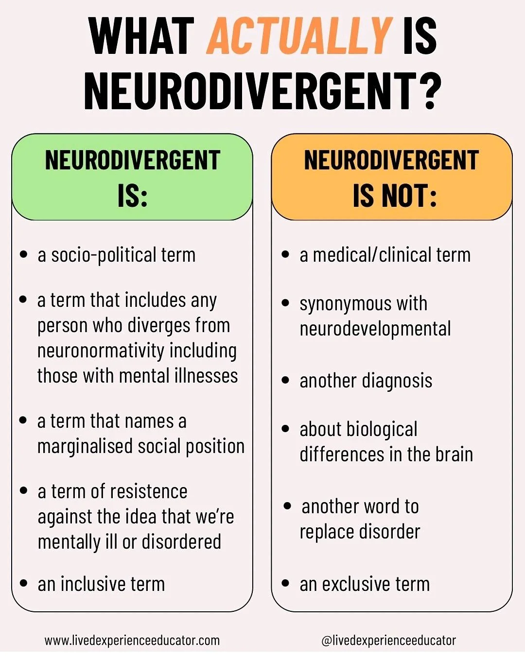 I’ve seen a few posts recently challenging the concept of neurodivergence as it is not a clinical term. So I really like this image as it explains what it actually is and isn’t.